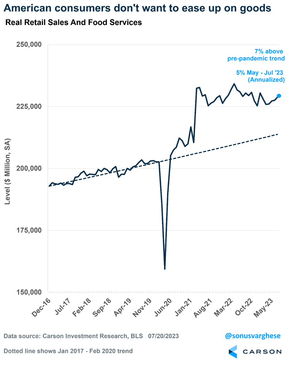 Here’s a nice chart of real retail sales showing very little slowdown in spending.