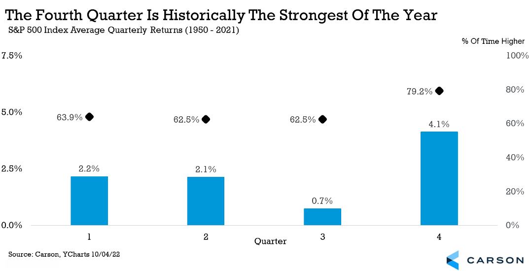 First, the fourth quarter is historically the best quarter of the year, with the S&P 500 up 4.1% on average and up nearly 80% of the time.