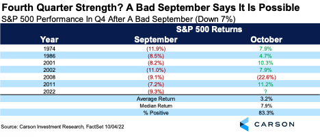 Fourth, the fourth quarter typically does even better when September is down big. Given this year saw one of the worst Septembers ever for stocks, this could be another clue a bounce back is possible. To quote Lloyd Christmas, “So you’re telling me there’s a chance!”