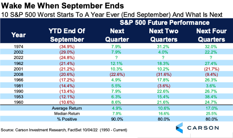 Fifth, this was the third worst start to a year ever for the S&P 500. The good news is this: Looking at the 10 worst starts ever to a year, the fourth quarter saw higher performance nine times. Only in 2008 was it red and fortunately, we don’t think we are in that type of environment. Going out a year, the S&P 500 was up eight times and higher a median of 25.5%.