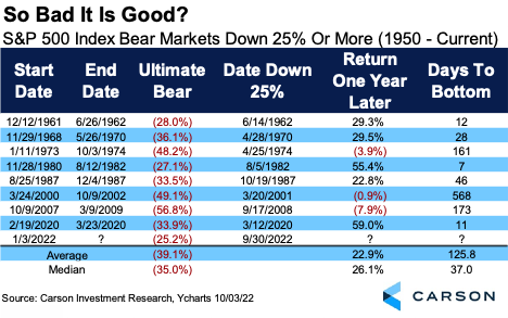 Sixth, the S&P 500 bear market cracked down 25% last week. As bad as that feels to investors, the stock market doesn’t care about what just happened and only cares about what is next. The good news is once a bear market is down 25%, the returns going out can be quite strong, with the S&P 500 up nearly 23% on average a year later. Additionally, many lows took place soon after this milestone was hit, so a major low could be near. Yes, the ‘73/’74 recession, tech bubble, and financial crisis all saw more weakness (and in some cases for a long time), but we don’t see an economy nearly as weak as those times. Therefore, we think this time will play out like the others and stronger returns going out could be quite likely.