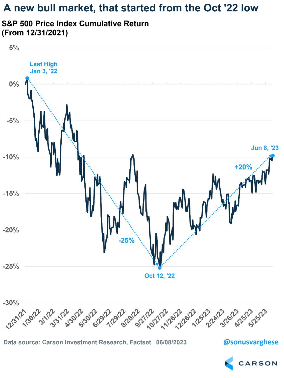 At Carson, we aren’t crazy about this definition of a bull market. We’ve believed for a while now that the bear market ended in October, but the financial media prefer the 20% definition. The bottom line is many bears have been proven wrong, as the economy continued to surprise to the upside, inflation came back to earth, and overall earnings estimates increased.