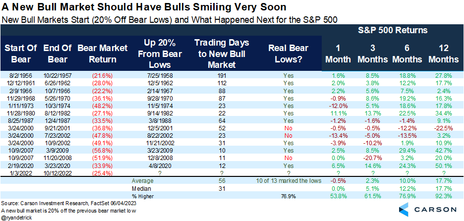 The market’s impressive run off the October lows continued last week. The S&P 500 officially closed up more than 20% from its low set on Oct. 12. In the face of continued skepticism, stocks have progressively moved higher. Now with stocks up 20%, they have officially entered a new bull market and the 2022 bear is over.