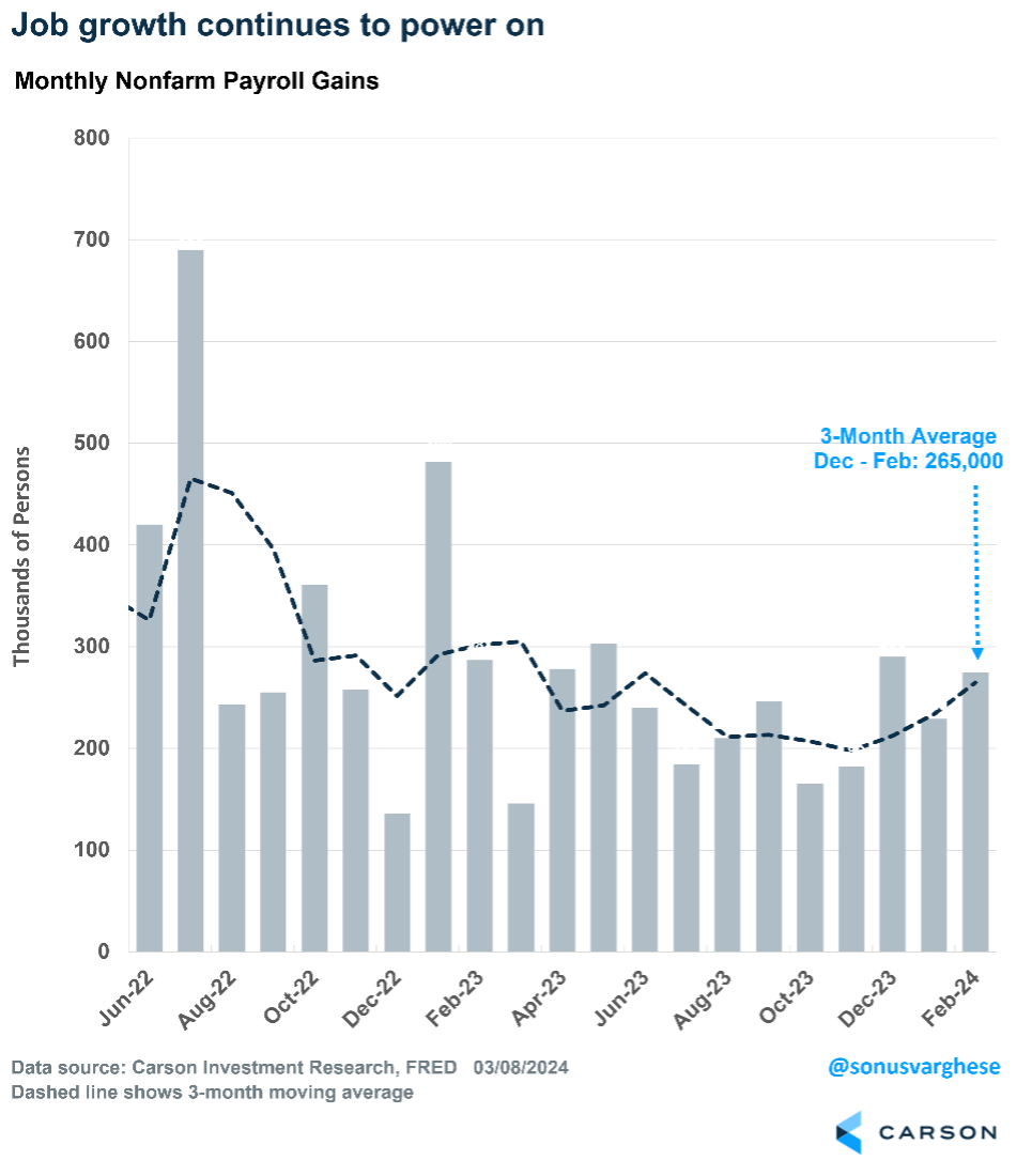 - The latest jobs report surprised to the upside, with 275,000 jobs created in February and an average of 265,000 created over the last three months.