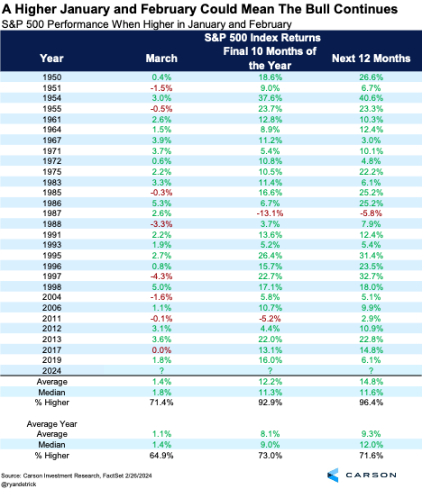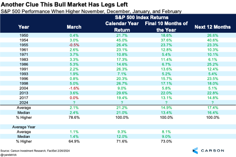 At Carson, we have been overweight equities since late 2022. It wasn’t very popular this time a year ago to say stocks were going higher and a recession wasn’t happening — few were. Today, we see few reasons to change our bullish outlook, and January and February’s results have added to the weight of evidence.