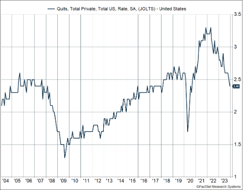 Another sign that a burst of wage growth (and inflation) is unlikely is the rate at which workers are quitting their jobs has fallen significantly over the last year. As a percentage of the workforce, the number of workers quitting their jobs is now at 2.4%, well below where it was a year ago and even lower than it was pre-pandemic. Lower turnover implies the labor market is not as hot as it was and validates the wage growth data.
