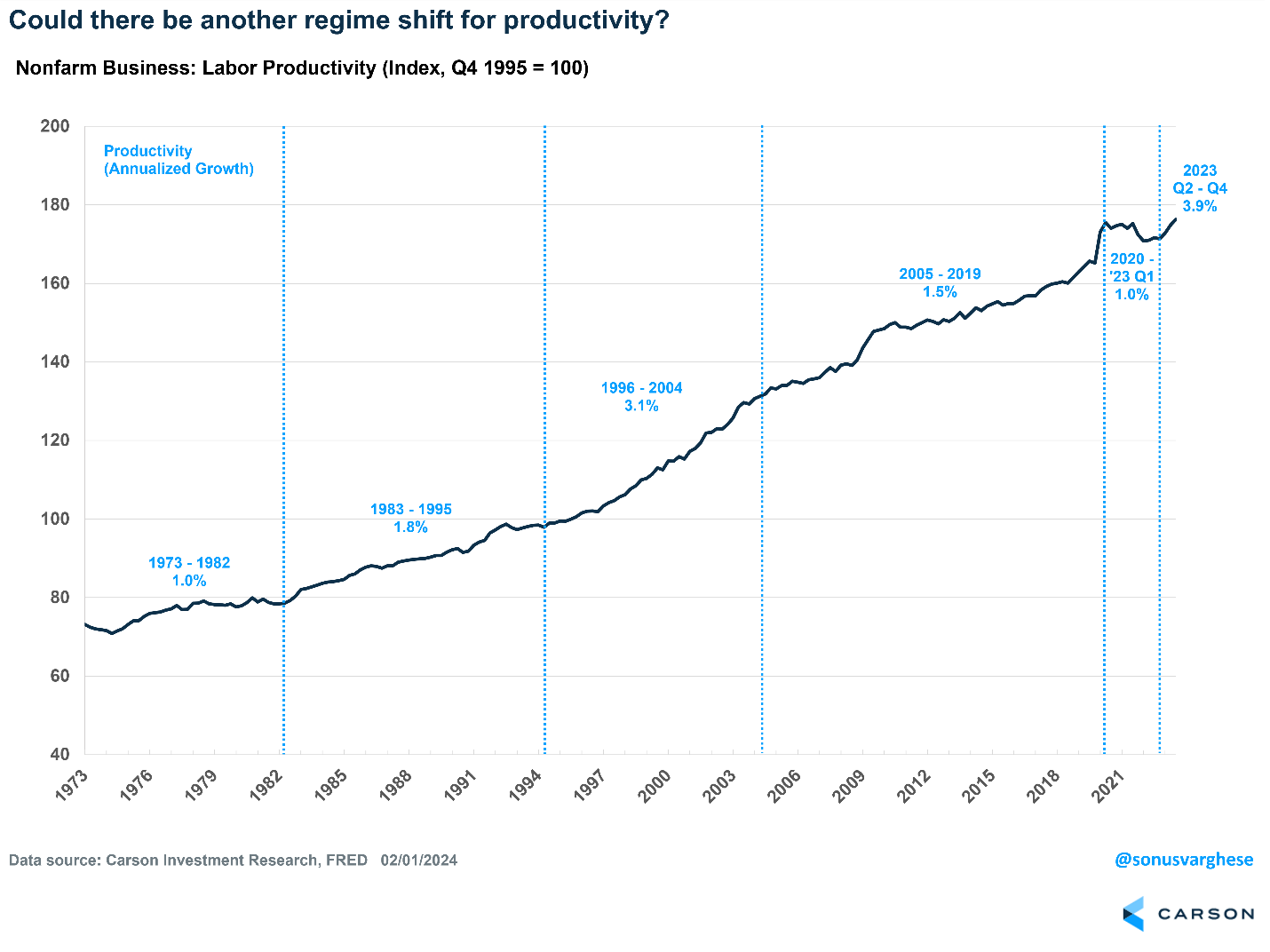 As noted above, wage growth is still elevated relative to where it was pre-pandemic. That’s not necessarily a bad thing. Inflation can remain muted if productivity is running strong, and we’ve seen some evidence of that. Over the last three quarters, productivity growth has run at an annualized pace of 3.9%, the strongest pace outside of recessions since the late 1990s. (Labor productivity artificially goes up during recessions and their immediate aftermath, as the same level of output is generated by fewer workers.) The lower quit rate is likely even boosting productivity, as workers often become better at their jobs when they stay with them for longer periods.