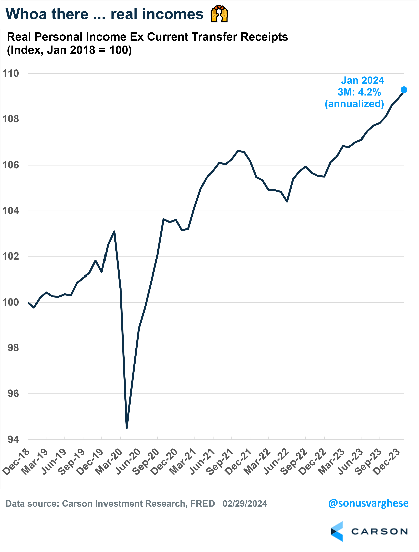 Ultimately, what matters for an economy that runs mostly on consumption is inflation-adjusted income growth. Relatively strong wage growth combined with decelerating inflation means real incomes are growing. Along with the latest PCE inflation data, the government also released personal income data, which perhaps got less attention than it deserved. Over the last three months, real incomes excluding transfers (like Social Security) are running at an annualized pace of 4.2%. For perspective, it was running at 2.6% across 2018-2019. Overall, the economy continues to be doing just fine.