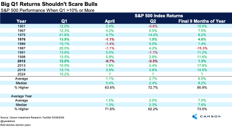 Following the huge 11.2% rally for the S&P 500 in the fourth quarter of 2023, the index provided an encore performance in the first quarter with a 10.2% gain. Big gains like this in Q1 aren’t common. The S&P 500 has gained more than 10% in the first quarter only 11 times in its history, and what followed was typically good for the bulls.