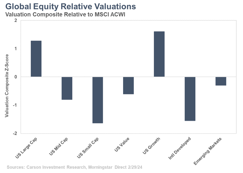 Globally, the same methodology can be applied to broad equity asset classes relative to the global index. Here we continue to see significant valuation discounts in domestic, small- and mid-cap stocks, especially given the dominance of large-cap growth in the global index.