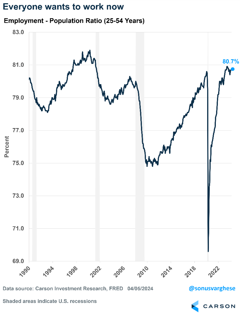 The unemployment rate had risen from 3.4% last April to 3.9% in February, raising concerns among some investors. There was a welcome pullback to 3.8% in March. That’s still higher than a year ago, but not by much. Moreover, higher rates of immigration are increasing the supply of workers, and there’s a lag between when new immigrants enter the workforce and how quickly they find jobs. In any case, I prefer the “prime-age” employment-population ratio, which shows how many people in their prime working years (25-54) are employed relative to the population. The measure is at 80.7%, exactly where it was a year ago and higher than at any point between July 2001 and February 2020. That shows how strong the labor market and economy are, with a higher proportion of prime-age adults working now than over the last two expansions.