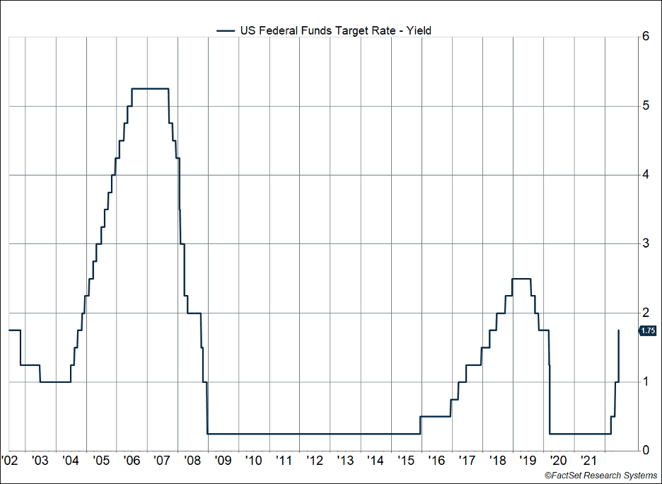 Much of the decline can be traced to the Federal Reserve raising rates 0.75%, signaling the central bank views more rapid action as necessary to tamp down inflationary pressures. With the hike, the Fed’s benchmark fund rate has a range of 1.5%-1.75%. It was the first time since 1994 that the Fed has raised 0.75% in one meeting. The Fed also raised its expectations for interest rates in each of the next three years, suggesting additional rate hikes should be expected (Figure 1).
