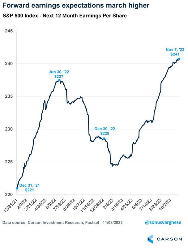 As we head into 2024, earnings could drive stocks higher. Analysts continue to come in too low on estimates at the start of earnings season. The third quarter was expected to finish with earnings slightly down over the trailing year, but S&P 500 earnings are now expected to gain 4% and analysts predict record profits over the next 12 months. When profits are at a record, stocks tend to follow, and we expect that to occur in 2024.