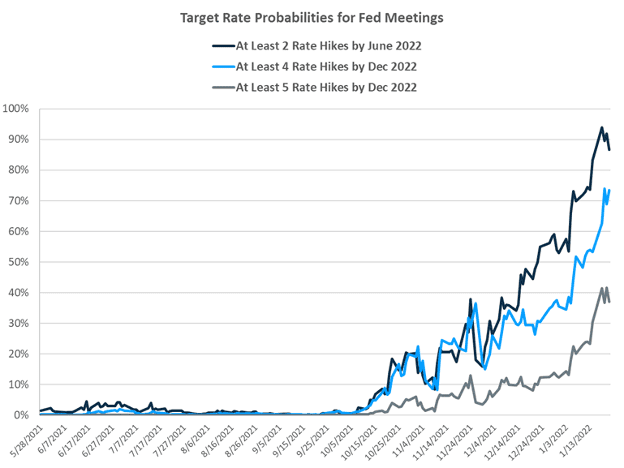 Equity markets have given back some of last year’s gains. Higher interest rates appear to be the major cause. As the Federal Reserve prepares for its first meeting of the year, investors have raised the odds of four interest rate hikes to approximately 70% from less than 30% one month ago (Figure 1). Fed Chair Jerome Powell’s press conference after the meeting will likely be scrutinized for further guidance concerning interest rates.
