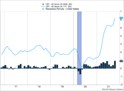 An inflation surprise created a challenge for investors. The Consumer Price Index rose 0.9% last month. The monthly increase was the largest reached in 2021, and the yearly increase of 6.2% was the largest since 1990, when the Gulf War contributed to a surge in oil prices (Figure 1).