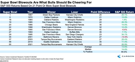 It might not matter which team wins but rather by how much they win. That’s right, the larger the size of the win, the better stocks do. (Let’s have another disclosure that nearly everything I’m saying here isn’t in any way, shape, or form related to what stocks actually do.) When the Super Bowl ends in a single-digit win, the S&P 500 is up less than 6% on average and is higher about 60% of the time. A double-digit win? The data jumps to about 11% and 79%. When the final score is three touchdowns or more, the S&P 500 gained 13.6% on average for the year and is higher about 85% of the time.