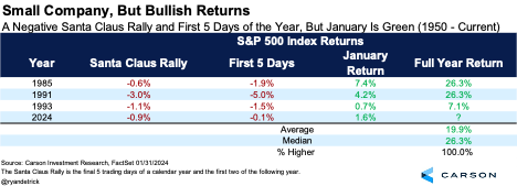 The huge end-of-year rally in 2023 (the S&P 500 was up 14% in November and December) did suggest some weakness in late December and early January would be normal. But the bottom line is the January gains matter more.