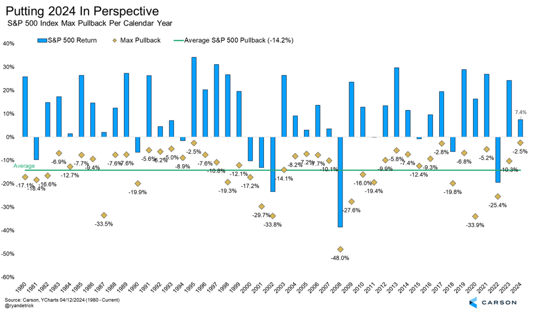 Here’s another perspective. The average year for the S&P 500 since 1980 has seen a peak-to-trough correction of 14.2%. More than three months into 2024, stocks have pulled back 2.5%, which would tie it with 1995 for the smallest pullback ever if things stay this way. We believe we are in a bull market and stocks will be higher at the end of the year. But it’s unlikely to be an easy ride.