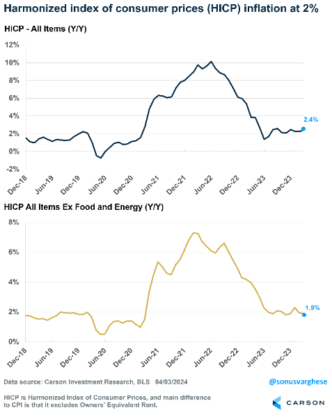 What’s strange is that the U.S. is the only major country that includes a concept like OER in its CPI basket. Other major countries, including in Europe and Canada, include rental inflation but not OER. The Bureau of Labor Statistics calculates an equivalent measure for the U.S. called the “harmonized index of consumer prices” (HICP), which is similar to CPI excluding OER. I find this a useful gauge of inflation because it includes regular rental inflation but excludes the problematic OER. It’s also helpful for comparing U.S. inflation to inflation in other countries on an apples-to-apples basis. U.S. HICP is up 2.4% since last year, and core HICP (excluding food and energy) is up just 1.9%. In March, core HICP rose 0.2%, equivalent to an annualized pace of 2.3%. This indicates underlying inflation is not worrisome.
