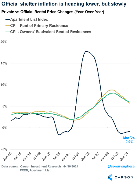 Unfortunately, CPI inflation is widely followed in the U.S. Shelter inflation, including March data, is easing, but it’s happening slowly. Apartment List’s national rental index has been in a year-over-year decline for 10 straight months. Official shelter inflation may not get as low, but more easing is likely in the months ahead.