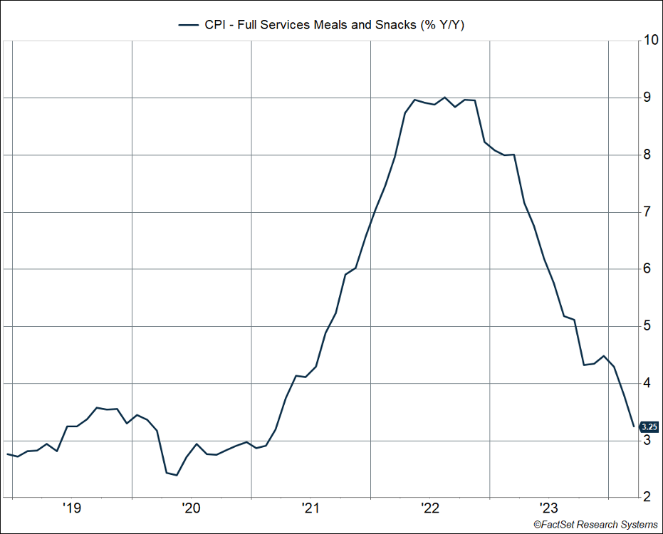 Inflation for restaurant meals has eased significantly over the last few months. It was up just 3.3% from last year, which is in line with where it was in 2019. At its peak in August 2022, inflation for restaurant meals was as high as 9%. The current level suggests underlying inflation is quite benign.
