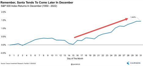 The following chart, which we shared at the start of the month, shows the latter half of December is when most of the seasonally strong gains occur. Of course, this year is anything but normal as the market experienced huge gains during the first part of the month.