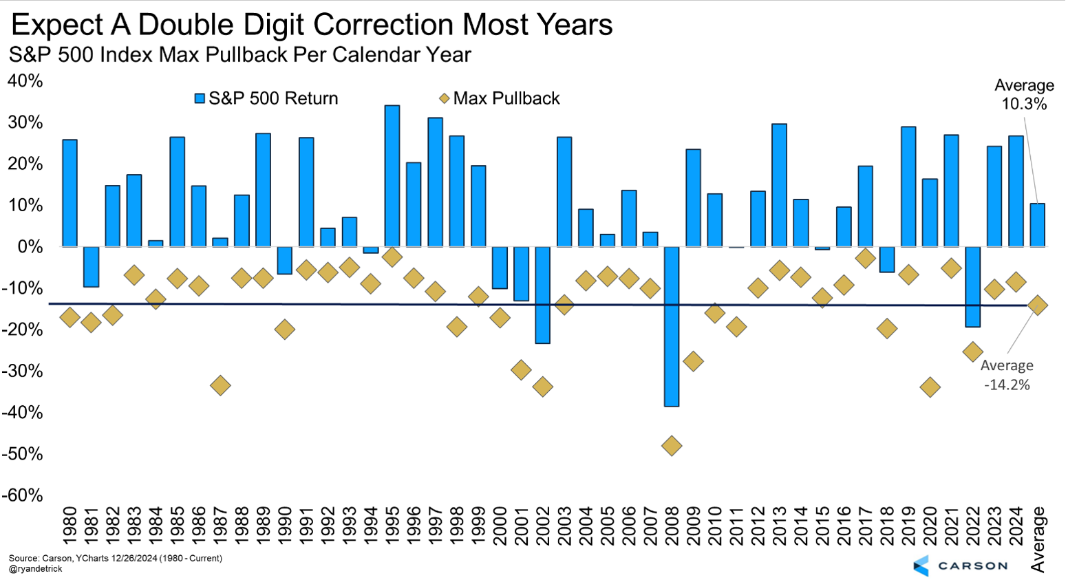 This is our last market commentary of 2024, and it may be the most important. The foundation of long-term investing success is understanding how markets behave in the long run. We share more tactical views as well, and they’re also important. In fact, in the second half of today’s commentary we look back at the recommendations we shared at the beginning of the year in our 2024 Outlook and how they turned out. (Our 2025 Outlook is coming out in just a couple of weeks!) But emotions can run high over shorter periods of time and that makes us all more vulnerable to poor decision making. Understanding the bigger picture helps tune out the noise, avoid some potential big mistakes, and stay on target to reach long-term goals.