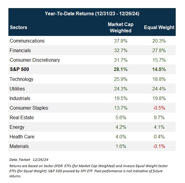 Another argument here is that it’s all about the Magnificent Seven stocks. But this would be bit of lazy analysis in our view. What’s interesting is that in 8 of 11 sectors, the market cap-weighted sector index outperformed the equal-weighted sector portfolio — industrials and utilities were the exception (the returns were close), along with real estate. So, this wasn’t just about Technology, or tech-adjacent stocks. In almost every sector, returns favored the largest companies. This is something we’re thinking deeply about and will discuss in the future.