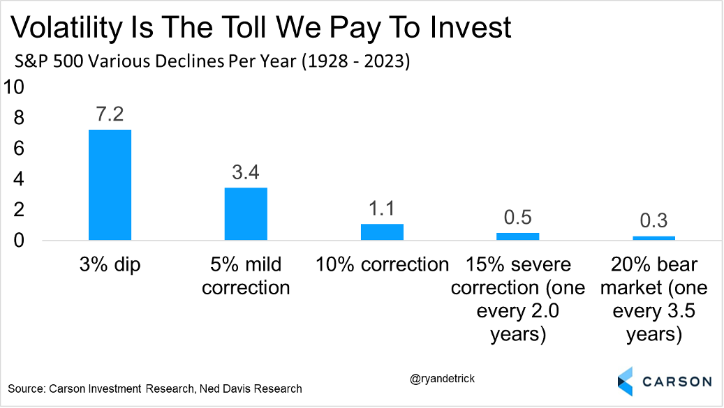 With thanks to our friends at Ned Davis Research, historically the average year sees more than seven 3% dips and more than three mild corrections of 5% of more a year. In fact, it is perfectly normal to see a 10% correction as well, as one happens on average once a year. Print this off and stick it to your desk, as investors could do themselves a big favor by remembering that each year will see volatility and it is the toll we pay to invest.