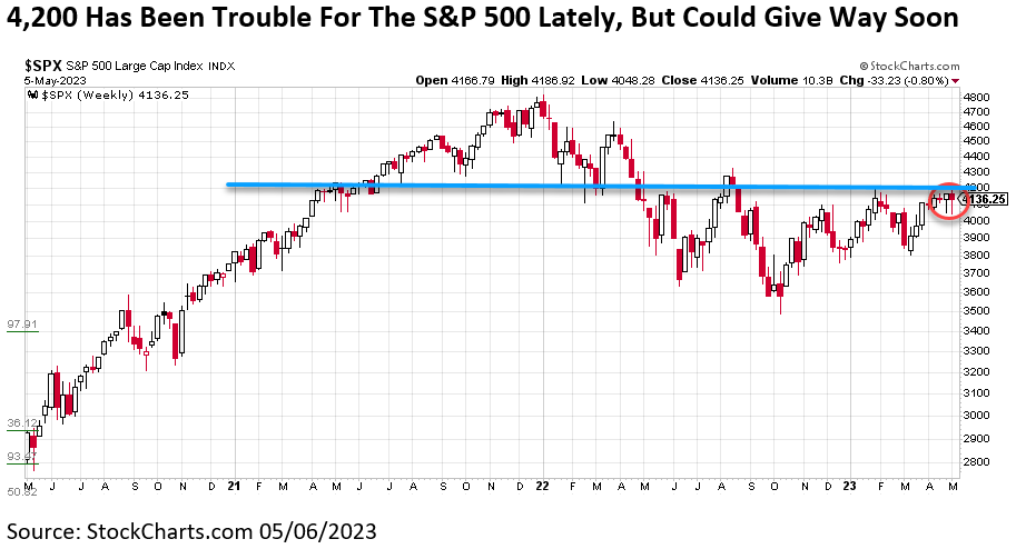 In what might come as a surprise for many investors, the S&P 500 is virtually flat over the past year. Despite countless negative events — record high inflation, a bond market crash, the most aggressive Fed policy in 40 years, the war in Ukraine, lockdowns in China, the second and third largest bank failures ever, an earnings recession, a mortgage market crash, and many more negative events — stocks are flat. To us, that’s a win and shows how resilient the economy and markets have been. Going forward, the 4,200 level on the S&P 500 is significant. As the chart below shows, this area has proved to be troublesome in the past. But we continue to expect higher prices in 2023 and think this level will give way soon.