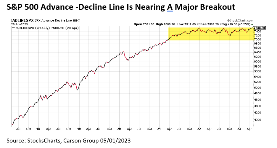 The S&P 500 A/D line shows another potentially bullish scenario. This one hasn’t quite broken out to new highs, but it is extremely close. Take note how this has trended sideways for the duration of the recent bear market, implying the tailwind for a bull market wasn’t happening. Should this break out, as we expect, it could suggest continued strength through 2023 and potentially beyond.