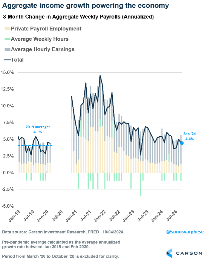 The September payroll report went a long way to ease some of these concerns (which is not to say risks have disappeared). Payrolls grew by 254,000 in September, doubling expectations for a 125,000 increase. Monthly payrolls can be noisy and subject to revisions, but July and August payrolls were revised higher, taking the 3-month average to a solid 186,000. This report also takes on outsized significance because the next two payroll reports are likely to be impacted by Hurricane Helene, with job growth pulled lower in October and reversing in November. The good news is that the port strike has ended, and so that’ll be a non-factor. In any case, it’s going to be January (when we get December payroll data) before we get another “clean” report.