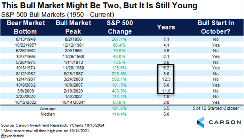 Here’s a table we shared last week, but we wanted to take a closer look at how long recent bull markets have lasted. The 114% rally after the pandemic didn’t quite make it to two years, but looking back fifty years (so back to 1974), every other bull market has had a lot more left in the tank after its second birthday. There were five bull markets over that time span that made it to the start of their third year, and the shortest one lasted 5.0 years (which actually happened twice). I like to think of this like a cruise ship — once it gets moving, it is hard to stop or slow down.