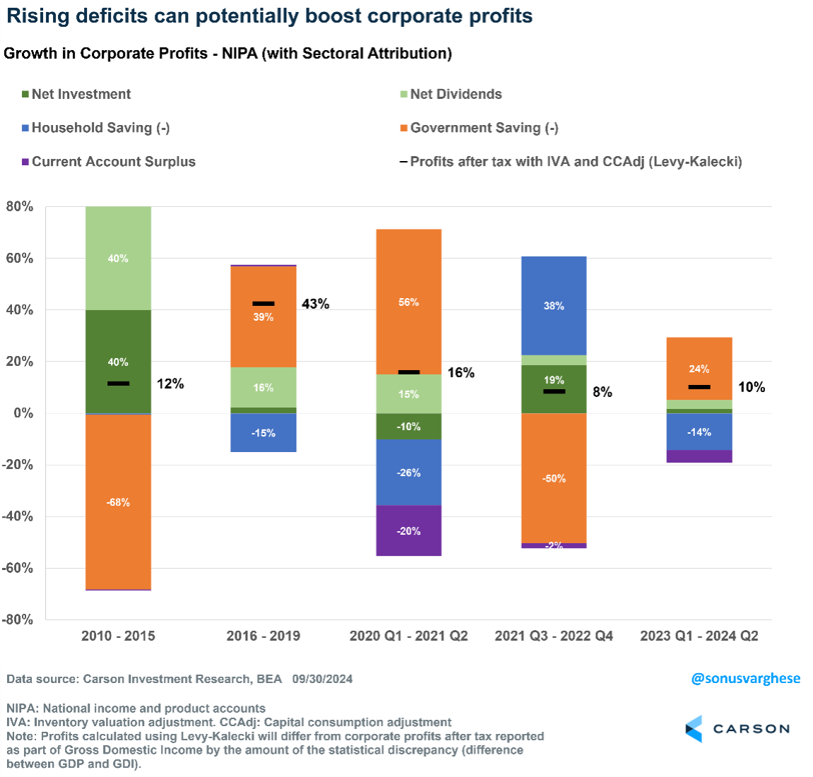 From a national accounting perspective, we can actually see the sources of profit growth by changes in the activity of key economic sectors (the same sectors used in calculating gross domestic product). Profits are increased by high household spending and lower savings; or higher business investment and dividends; or lower government savings and increased spending; or greater demand for US goods abroad and lower US purchases of foreign goods. The relationship between these changes and profits is actually mathematical, so we can look at national accounts and see the story of what has driven profit growth. Any of these areas can increase profits (or decrease them when working in reverse), and it’s useful to see where profit growth has come from at different times.