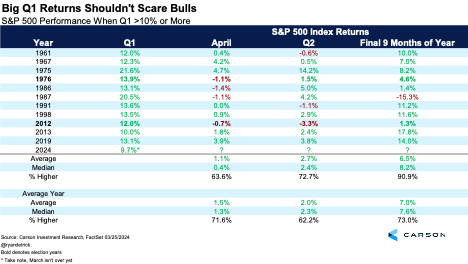 It’s April 1, and the first quarter of 2024 is in the books. On the heels of more than 25% in total return for 2023, the S&P 500 returned more than 10% in the first quarter. The logical question is: How much is too much? Looking at the numbers, more good news could be in store for the bulls.