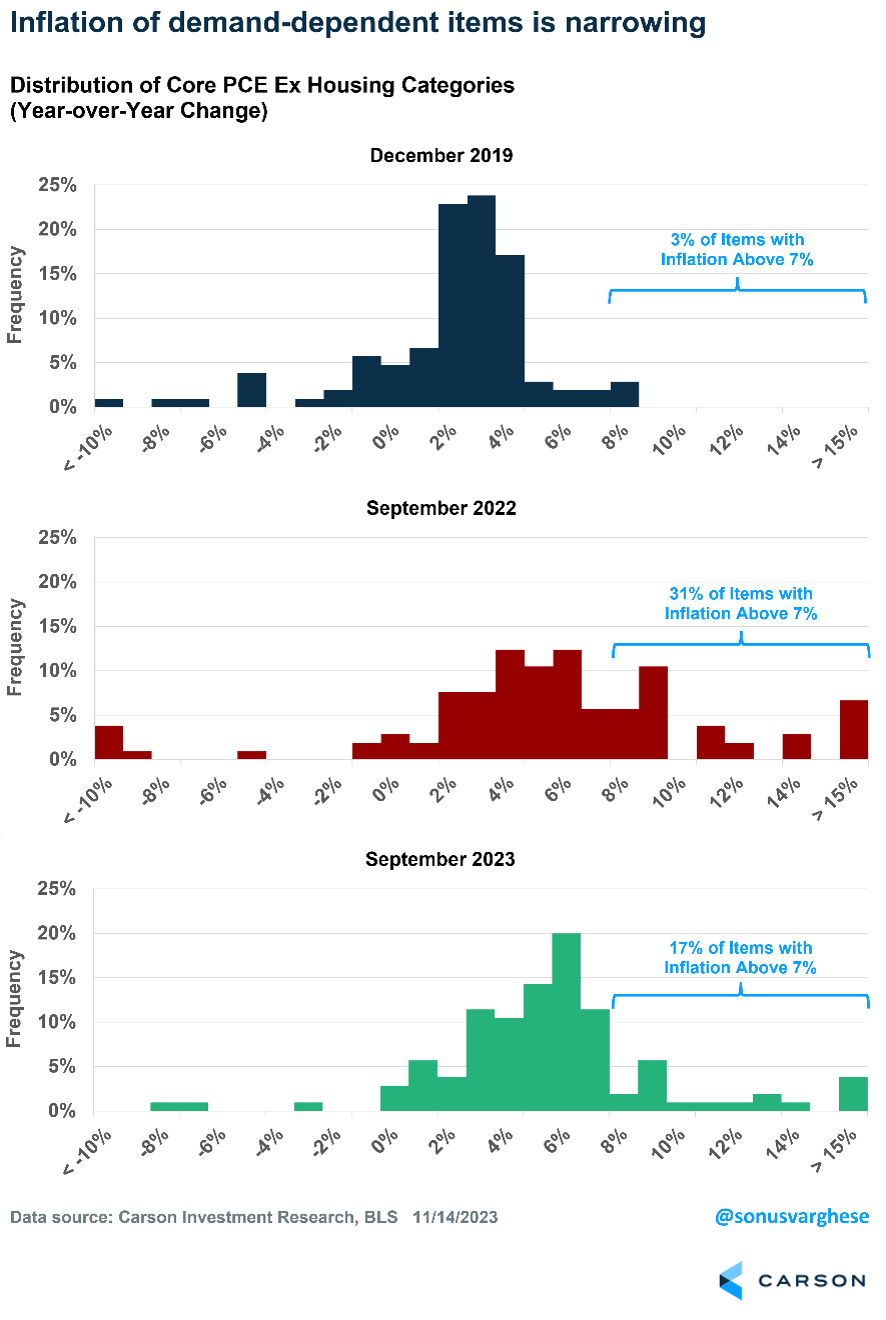 Encouragingly, disinflation is occurring even in the core services ex housing categories. That’s happened as the economy has accelerated above trend the past year and the unemployment rate has remained under 4%. We reviewed the items that make up core services ex housing — about 105 in the PCE data — and calculated the distribution of year-over-year price increases in three periods: