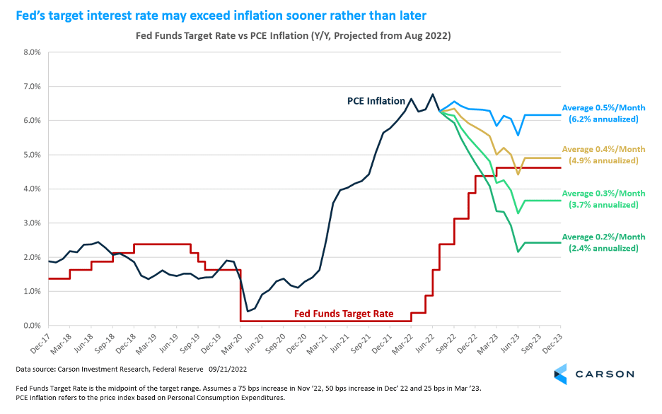 So, there is a high likelihood that the federal funds target rate (as projected) may rise above year-over-year inflation numbers within the first half of 2023. The chart below shows various projections for PCE inflation (the Fed’s preferred measure), based on average monthly price changes over the next 15 months. This assumes the Fed will raise rates by another 0.75% in November, 0.50% in December and 0.25% in March 2023. In our view, the scenario in which price increases average 0.3% month-over-month is quite plausible. That would take PCE inflation down to 3.7% by mid-2023.