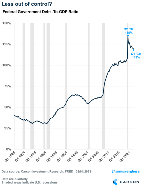 Without getting too technical, Fitch cited growing debt as a concern. But overall debt relative to gross domestic product (GDP) has been trending lower (improving) for nearly three years.