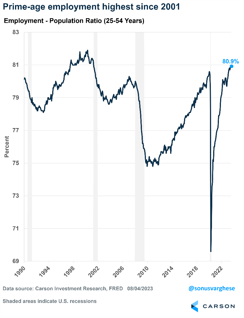 The unemployment rate can be impacted by people leaving the labor force (technically defined as those “not looking for work”) and an aging population. Reviewing the employment-population ratio for prime age workers, i.e., workers aged 25-54 years, provides a more accurate picture. This measures the number of people working as a percentage of the civilian population. It can be considered the opposite of the unemployment rate, and using prime age avoids the numbers being skewed by demographic shifts.