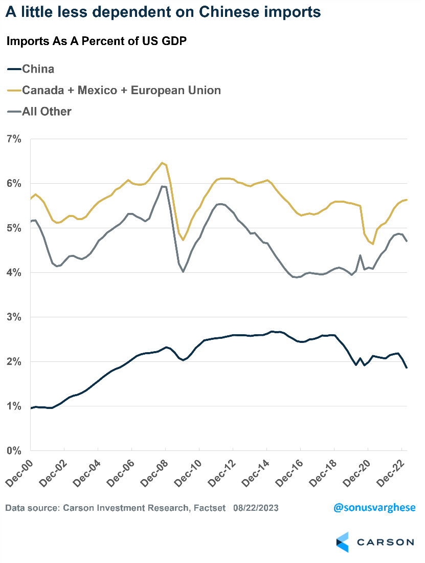 From an economic perspective, there’s probably not going to be a significant adverse impact on the U.S. economy. U.S. imports from China have fallen significantly over the past year. U.S. consumers need fewer pandemic-related materials and other goods as they continue to spend more on services. There is also some decoupling occurring, with goods imports from China falling as a percentage of GDP. Currently, it is below 2% of GDP, which is the lowest it has been since 2006. Instead, imports from other countries have picked up.