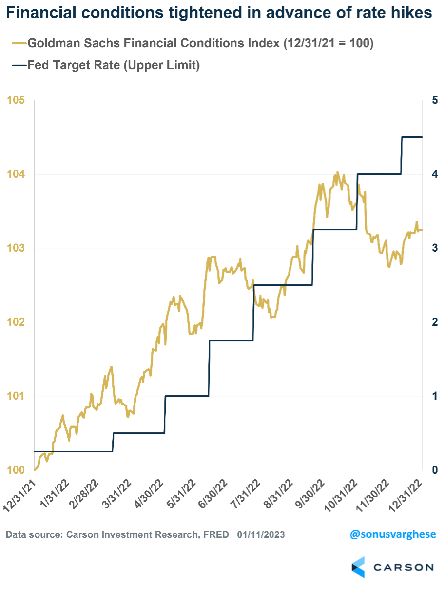 In fact, because of the Fed’s forward guidance and other commentary (including leaks to the press), financial conditions can tighten well in advance of actual rate hikes, as investors anticipate future Fed actions. The chart below illustrates this point. Across 2022, financial conditions tightened well ahead of the Fed’s rate hikes.