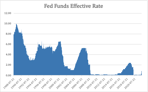 The Fed has already raised rates two times this cycle and even elected for the rare 50-basis-point increase for the first time since May 2000. Rates have been near zero since 2008, outside of a quick rate rise in 2017–19.